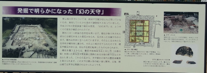 | 「天守への道 ~謎多き付櫓台の実態」…説明によれば、現在の天守台にある階段は明治時代につけられたもので、ありし日にどのように天守に入ったのか実態は不明であった。平成26年の発掘調査の結果、付櫓地階の石垣や礎石が見つかった。右端の写真の説明では、発掘で明らかになった「幻の天守」はようやくその実在が確認されたとか |