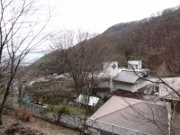 | 登山道を上がり始めた場所から、積翠寺温泉「要害」と甲府盆地を見る…あいにくの天候だったが晴れていれば眺望が素晴らしいだろう。真ん中の写真は少し歩いて振り返って見たところ。右端の写真では、早くも最初の石積が見えて来た。 |