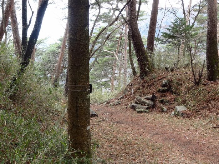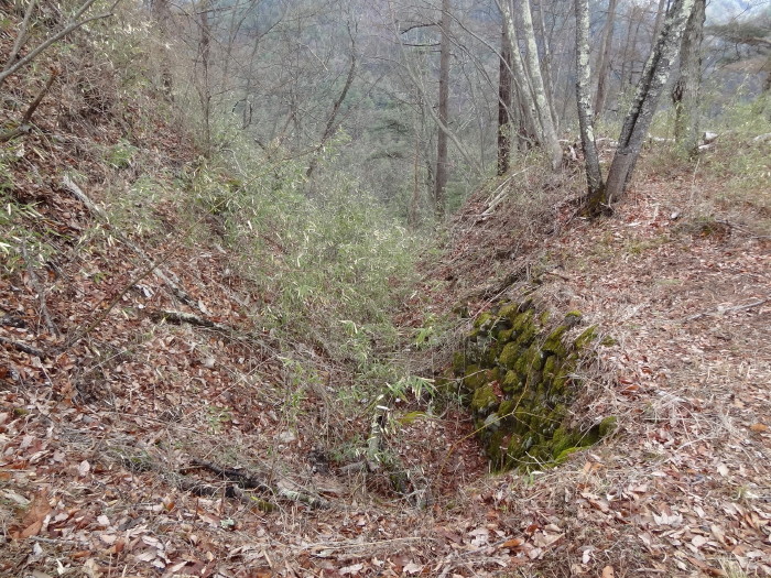 | 主郭から更に東方向へ行くと「堀切跡」の標示柱…下の写真を見ると石積みを用いた堀切 |