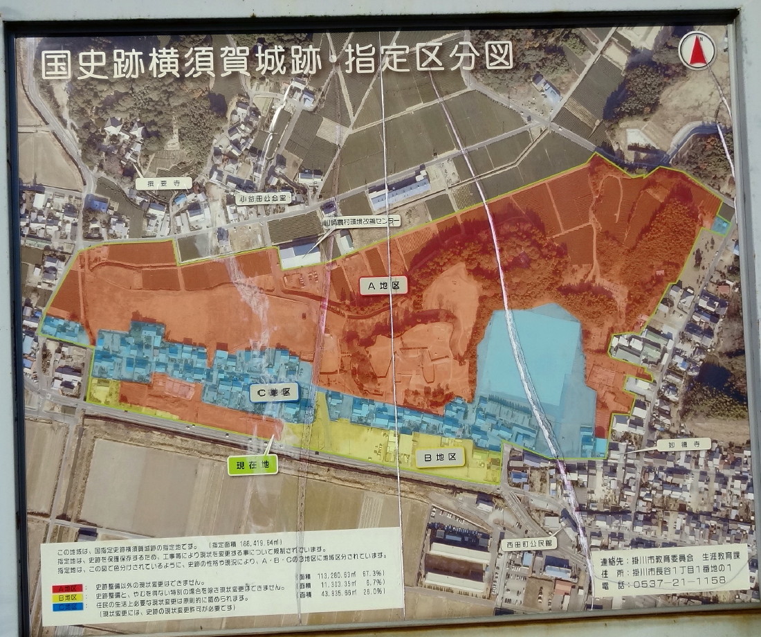 - 明治維新の廃城と国史跡指定:明治元年(1868)20代城主西尾忠篤は、明治維新の激動のなか、安房国花房(現千葉県鴨川市)に移され、横須賀藩領は徳川家達(いえさと)の領地となって静岡藩に含まれました。明治2年8月には横須賀城も廃城となりました。明治6年には城内の土地、建物、石垣、立ち木まで民間に払い下げられて、街並みや田畑が形成され、更に堀も埋め立てられ城としての景観を失いました。そして昭和46年に本丸一帯を宅地化する計画が持ち上がり、この城跡消滅の危機に住民から城跡保存の声が上がり、昭和56年5月8日付で国史跡に指定されました。以後、土地公有化と遺構復元整備が進められています。