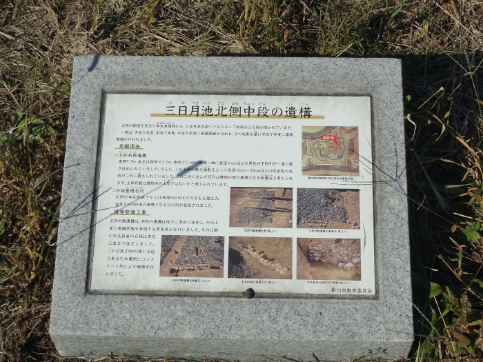 駐車場から西の丸台地へ上がる斜面の石段の説明…発掘調査結果に基づき遺構を復元している由。 |
