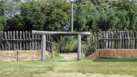 | 南のムラから市の広場方向を見る。一部木柵とその前に空堀が… |