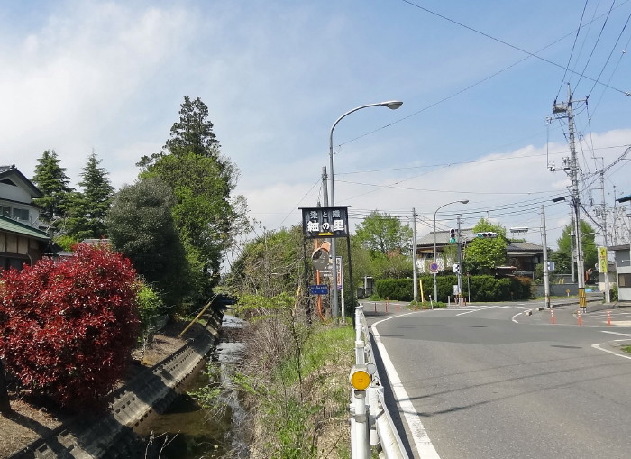 北口からの道路と20号と交差する場所で、この道標が。城跡は真っ直ぐ行くが、先ずは孝顕寺・称名寺へ行く… |