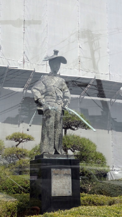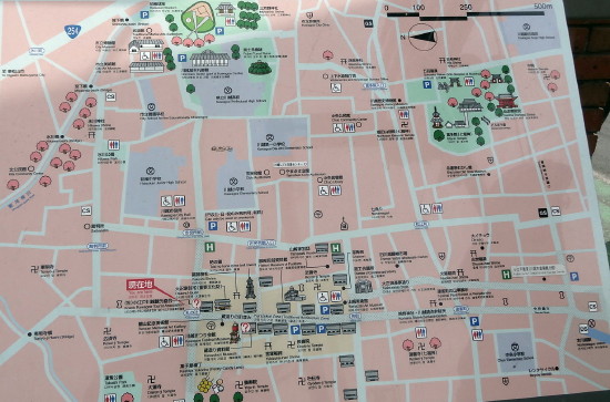 | 東明寺から札ノ辻に戻る…現在地のところにあった案内図 | 市役所前にあった「川越城大手門」の石碑…市役所が耐震工事中でプラスティックの壁越しに見る | |