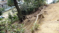 | 神社の看板の裏手から続く土塁…右の写真の手前側部分。 | 右側の神社本殿の裏から手前の土塁部分まで土塁が続いていて、その間に虎口があったと思われる。 | |
