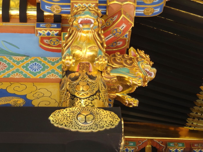 | 唐門に施された彫刻… | 逆さ葵…葵の御門が「逆さ」になっている部分がある。左の写真ではわかりにくいですね。拡大してみると(右の写真)分かりますね?パンフによると、建物が未完成であることを表しており、更なる発展への願いが込められていると言われている由。 | ||